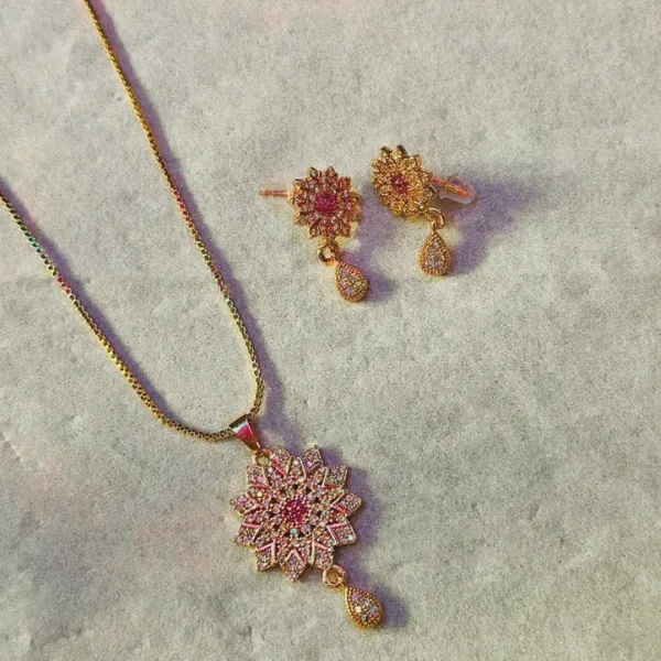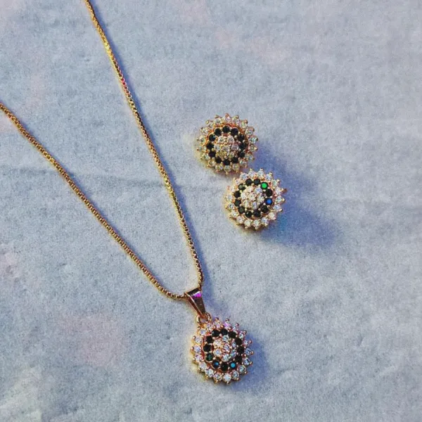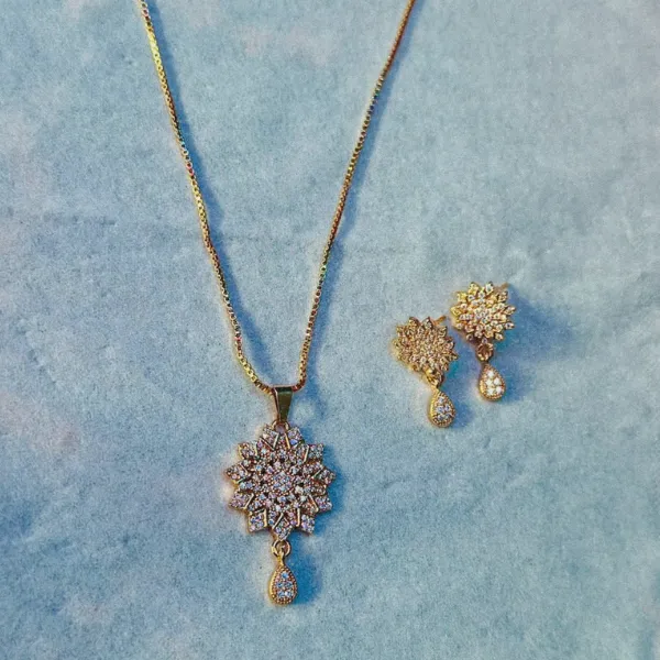 + Free Shipping (on RS 2000 order)Celestial Halo Pendant Set features a beautifully crafted round pendant with matching earrings, designed with intricate crystal detailing and a radiant gold-tone finish. The halo-inspired circular pattern creates a graceful and eye-catching sparkle, perfect for both everyday elegance and special occasions. Lightweight and refined, this set adds a subtle yet luxurious touch to any outfit.