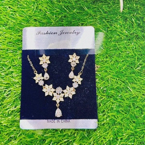 + Free Shipping (on RS 2000 order)This elegant crystal floral jewelry set features sparkling flower-shaped stones with a graceful drop pendant, creating a luxurious and eye-catching look.