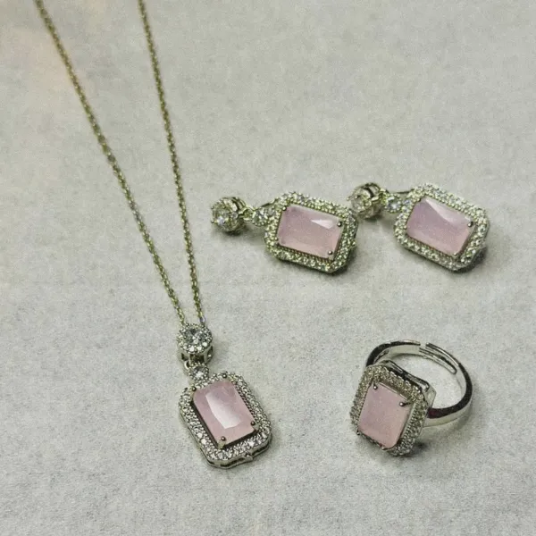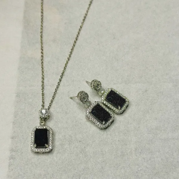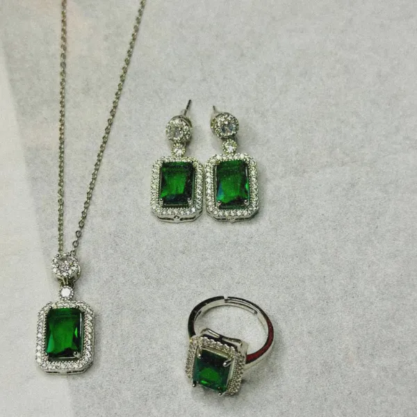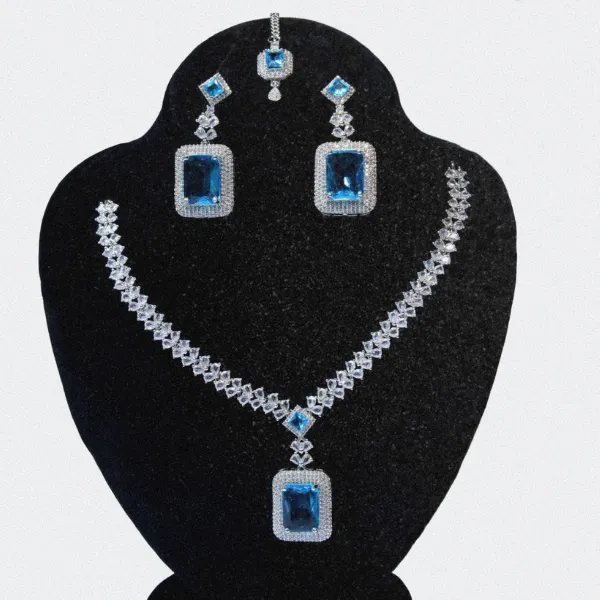 + Free Shipping (on RS 2000 order)Royal Sapphire Elegance Set is a complete necklace, earrings, and ring combo featuring a deep blue sapphire-style stone with sparkling zircon detailing for a premium, royal look. Its elegant emerald-cut rectangular design makes it perfect for weddings, parties, and formal events. Finished in a refined silver tone with a lightweight feel and adjustable ring, this set offers both style and comfortable wear.